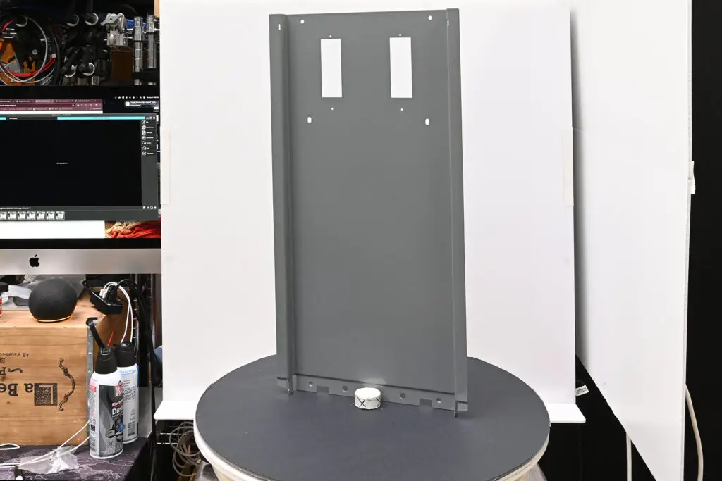 Some of the electrical panels photographed for this catalog were tall, narrow, and unable to stand upright on a rotating platform without support. To safely capture the full 360-degree rotation, a temporary brace was used to stabilize the product during photography.